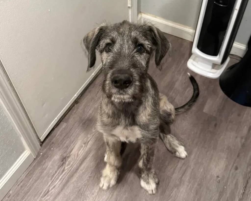 Un Irish Wolfhound assis sur un plancher et regardant vers la caméra