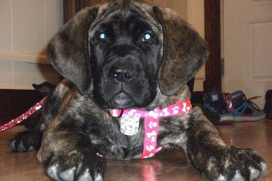 Un Italian Daniff portant un collier rose et allongé face à la caméra sur un sol en bois