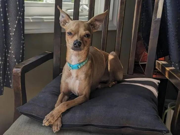 Un Italian Greyhuahua assis sur une chaise et portant un collier autour du cou