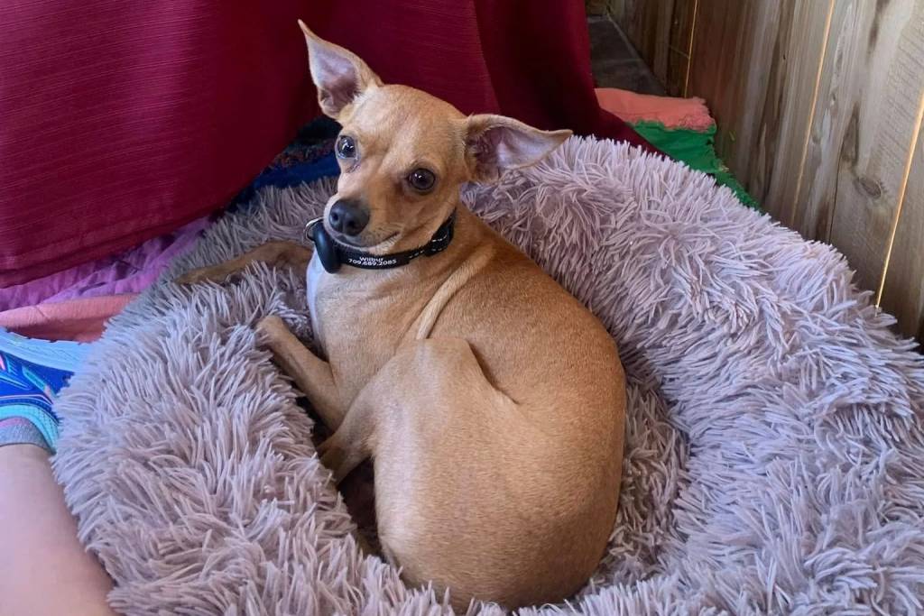 Un Italian Greyhuahua allongé dans un panier et portant un collier autour du cou