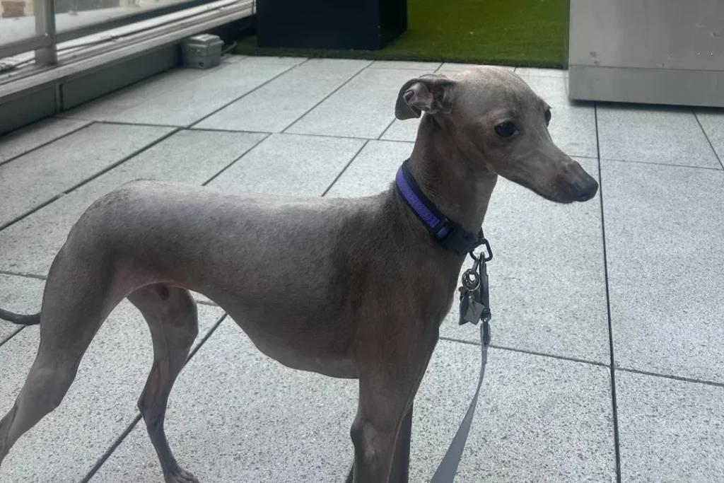 Un Italian Greyhuahua sur une surface bétonnée et qui est tenu en laisse