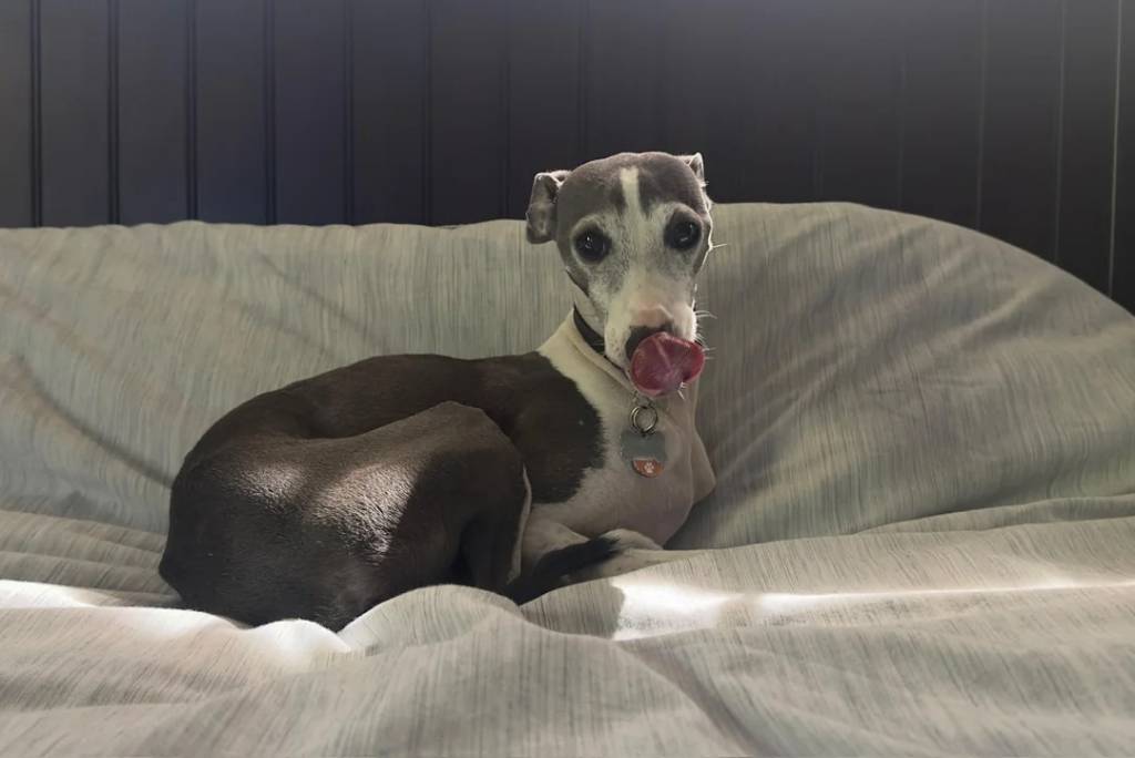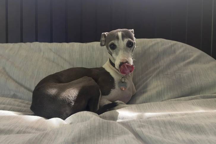 Un Italian Greyhuahua léchant son museau et portant un collier autour du cou