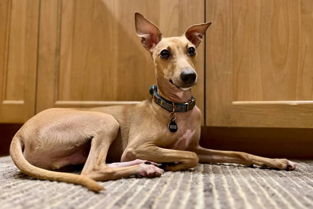 Un Italian Greyhuahua allongé sur une moquette et portant un collier autour du cou