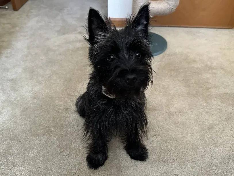 Un Jacairn assis sur une moquette et portant un collier autour du cou