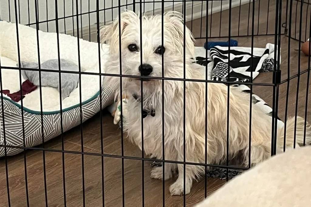 Un Jacairn assis dans une cage et portant un collier autour du cou