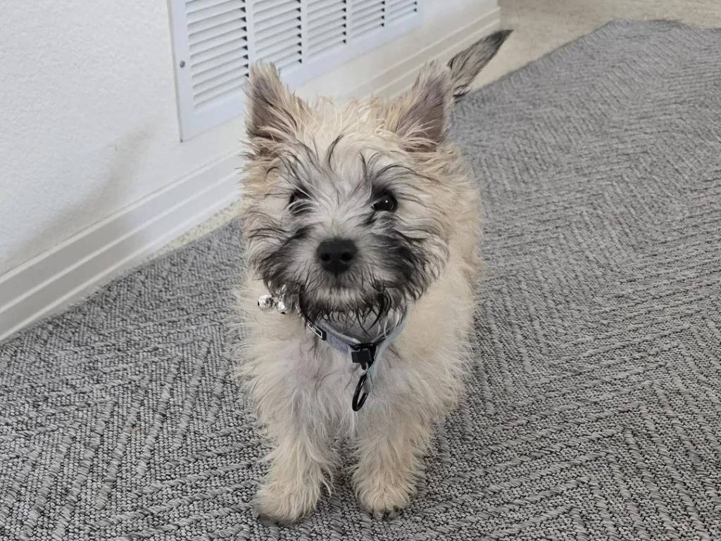 Un Jacairn sur un tapis et portant un collier autour du cou