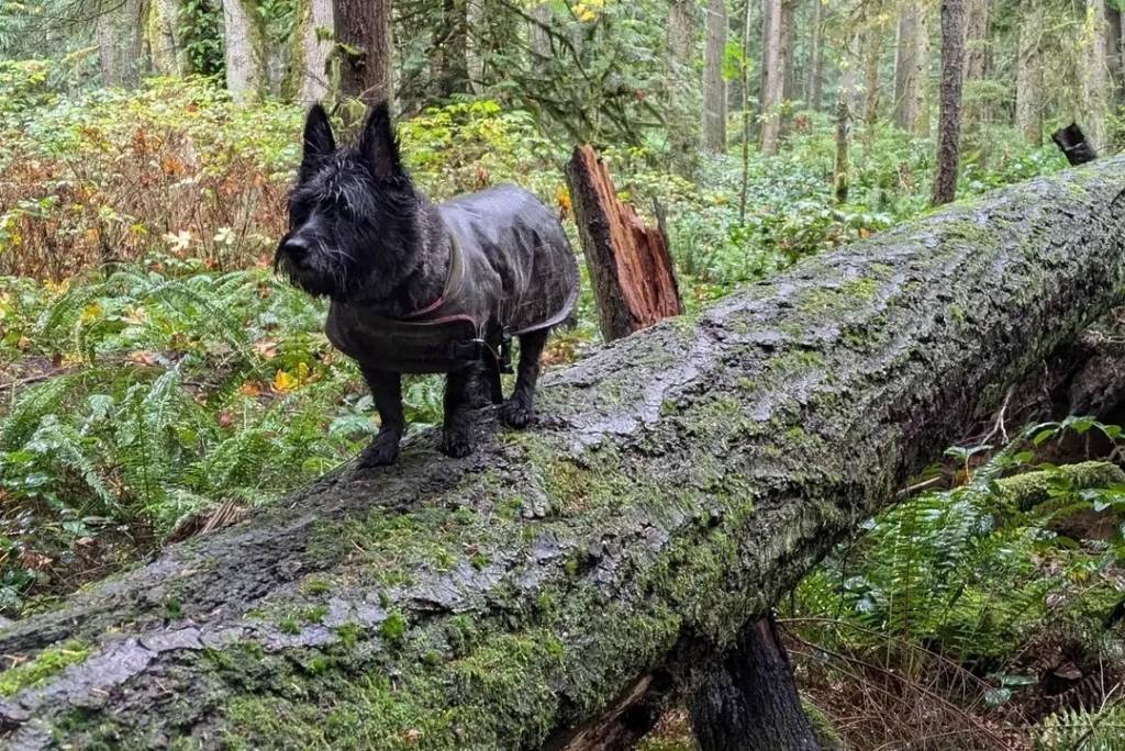 Un Jacairn sur un tronc d'arbe et portant un habit pour chien