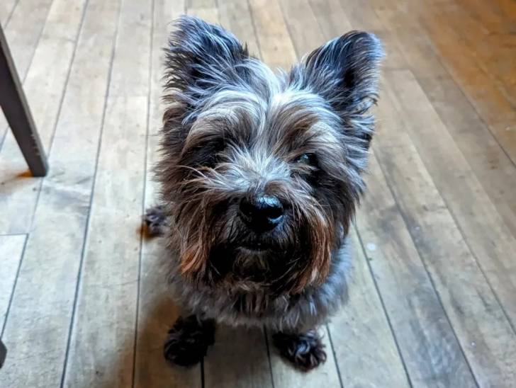 Un Jacairn assis sur un plancher et regardant vers la caméra