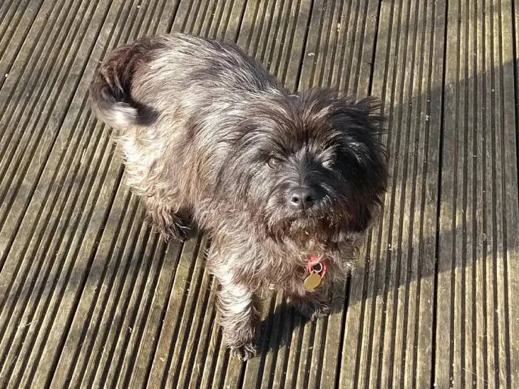 Un Jacairn portant un collier autour du cou et regardant vers la caméra