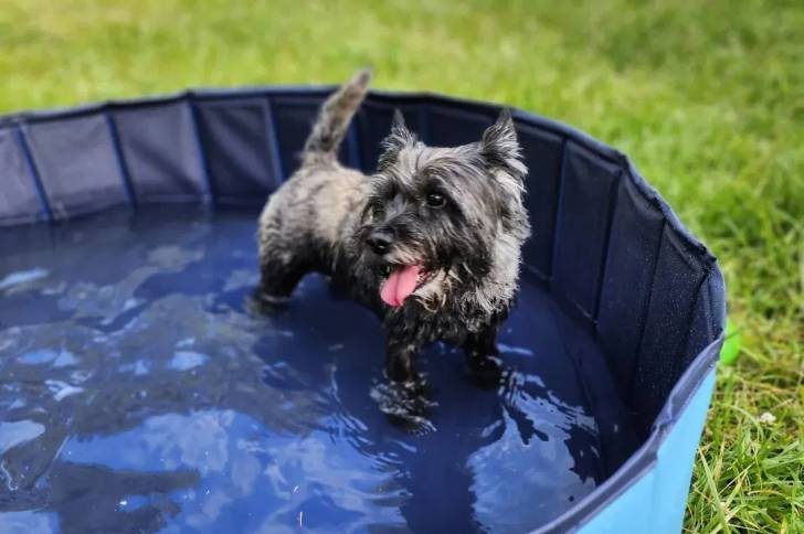 Un Jacairn dans une piscine et tirant la langue