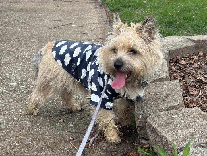 Un Jacairn tirant la langue et qui est tenu en laisse
