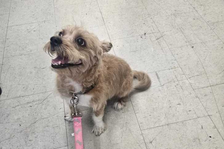 Un Jacairn assis sur un sol carrelé et qui est tenu en laisse