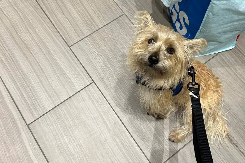 Un Jacairn sur un sol carrelé et qui est tenu en laisse