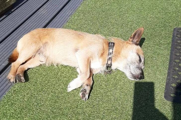 Un Jacairn allongé sur du gazon synthétique et portant un collier autour du cou