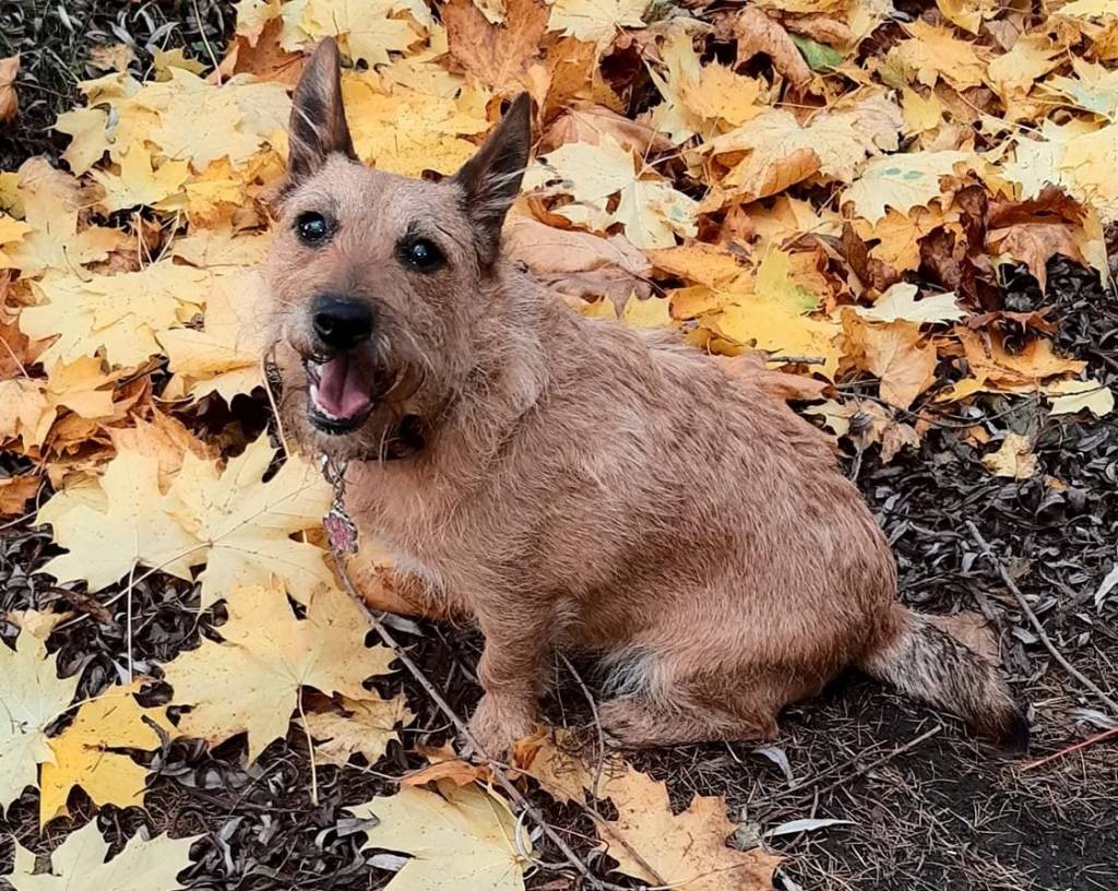 Un Jacairn assis sur un terrain herbeux et portant un collier autour du cou