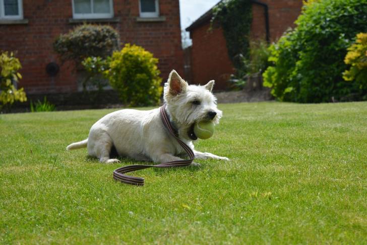 Un Jacairn allongé sur un terrain herbeux tenant une balle de tennis dans sa gueule