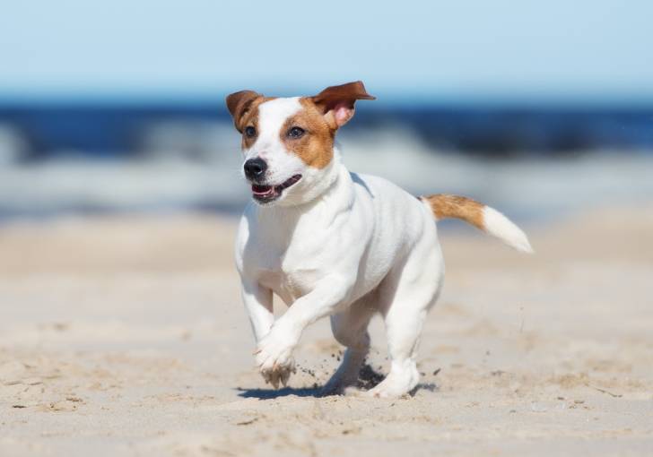 Un Jack Russell fauve et blanc en train de courir sur la plage
