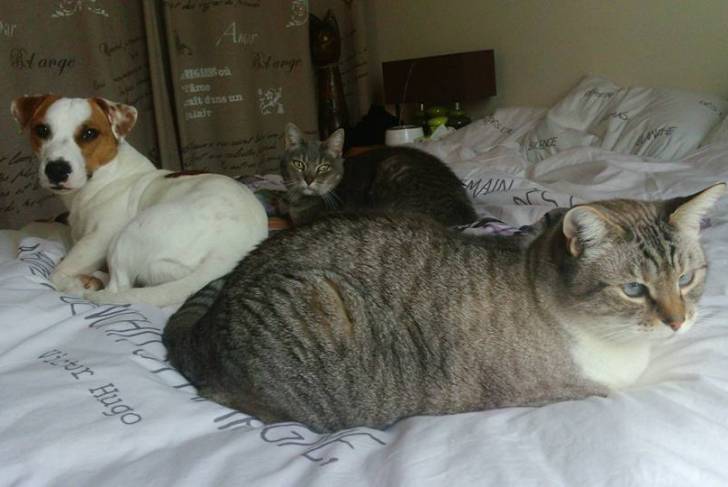 Un Jack Russell et deux chats allongés sur un lit