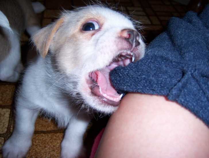 Un Jack-Tzu mordillant le bras d'une personne portant un vêtement