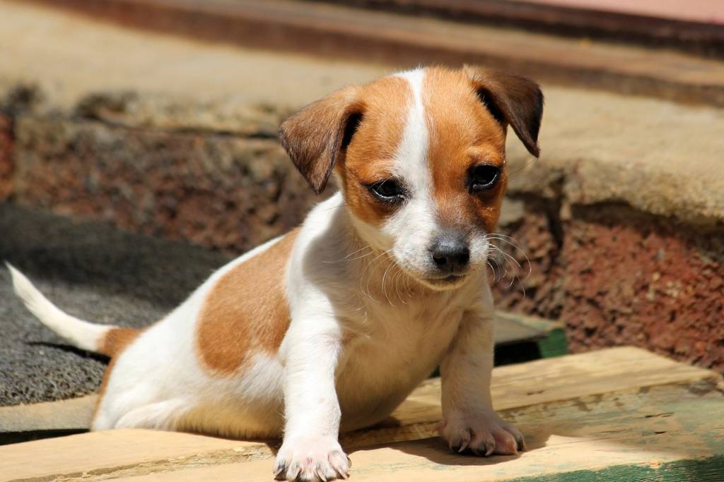 Un chiot Jackshund au pelage bicolore marron et blanc, à cheval sur des planches de bois