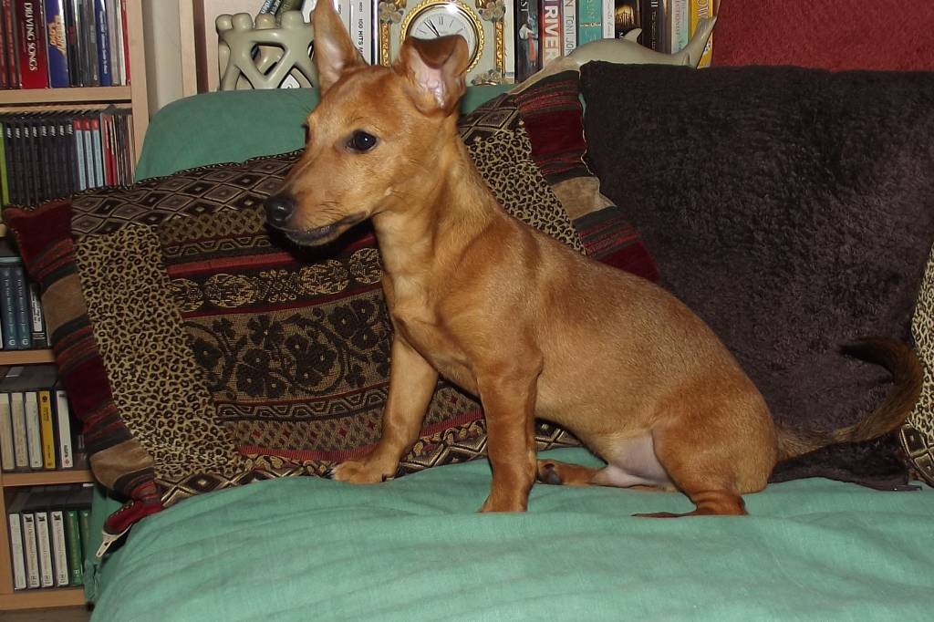 Un Jackshund au pelage marron, ayant une oreille dressée et une oreille baissée, assis sur un canapé