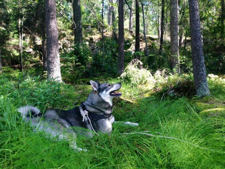 Un Chien d'Élan Suédois réagit à des sons de guitare