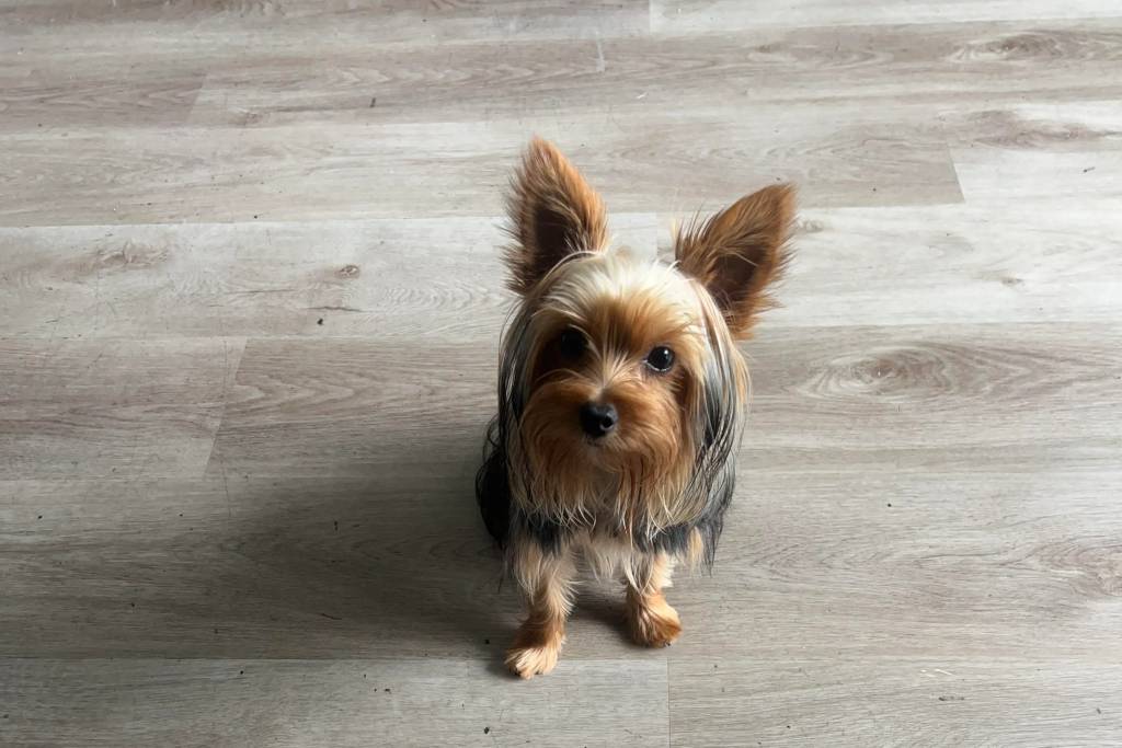 Un Jorkie assis sur un plancher et regardant vers la caméra