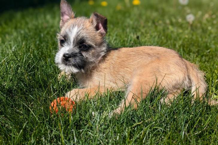 Un adorable petit Jorkie sent et mordille les doigts de son maître