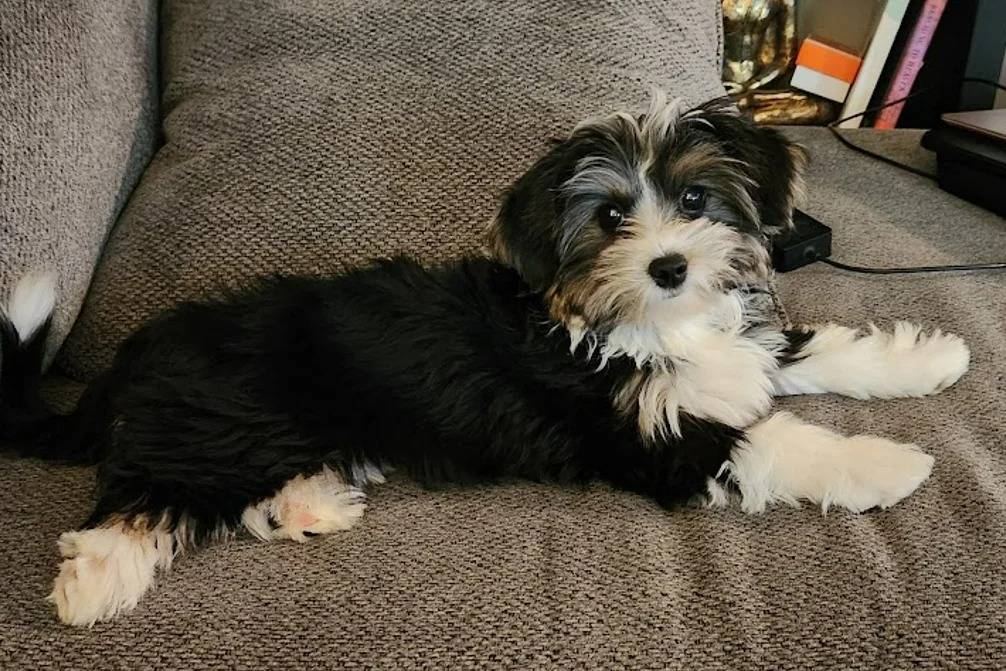 Un Jorkie allongé sur un canapé et regardant vers la caméra