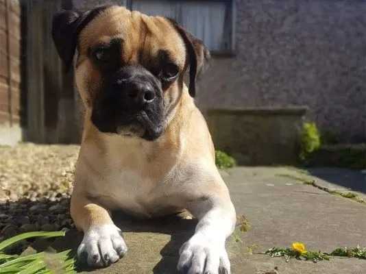 Un Jug allongé sur un chemin de pierres et regardant directement la caméra