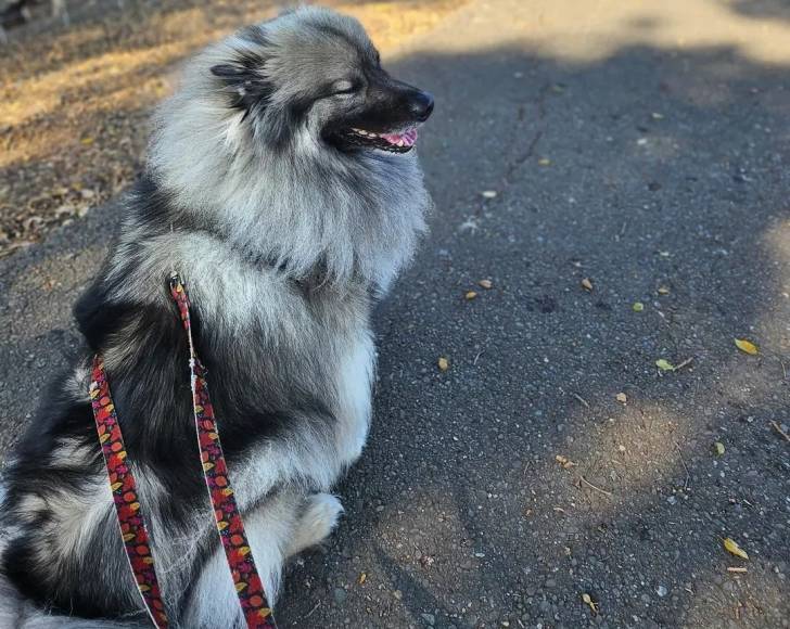 Un Keeshond sur une surface bitumée et qui est tenu en laisse