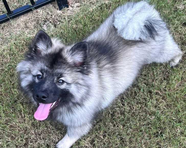Un Keeshond allongé sur une surface gazonnée et tirant la langue