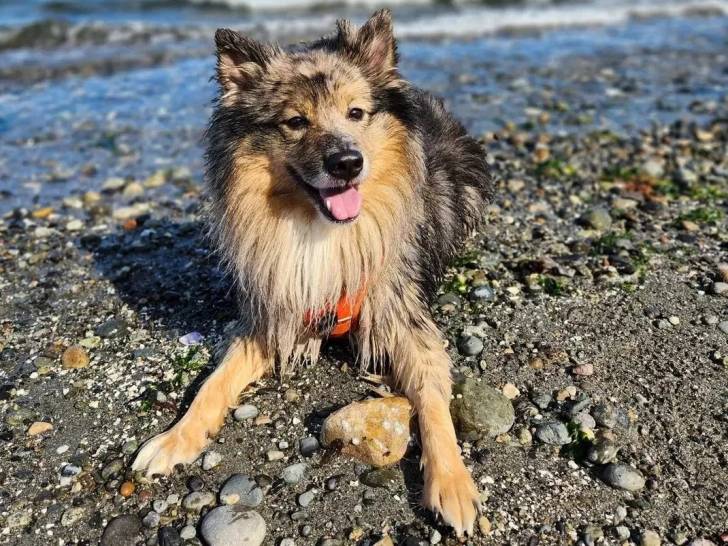 Un Keeshond allongé sur une berge et portant un harnais