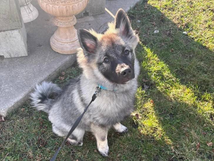 Un Keeshond assis sur un terrain herbeux et qui est tenu en laisse