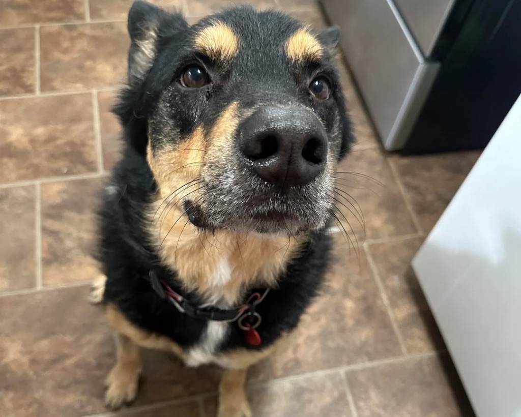 Un Kelpie Shepherd assis sur un sol carrelé et portant un collier autour du cou
