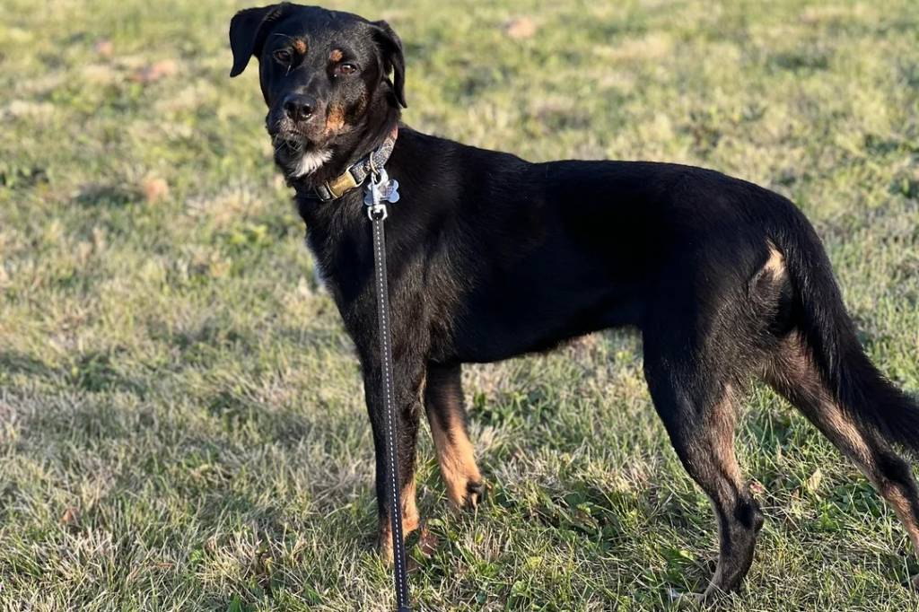 Un Kelpie Shepherd sur une surface gazonnée et qui est tenu en laisse