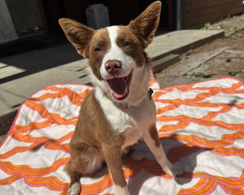 Un Kelpie Shepherd assis sur un tapis et ayant la gueule ouverte