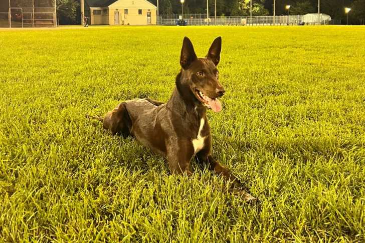 Un Kelpie Shepherd allongé sur une surface gazonnée et ayant la langue pendante