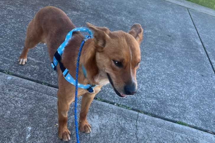 Un Kelpie Shepherd sur une surface bétonnée et qui est tenu en laisse
