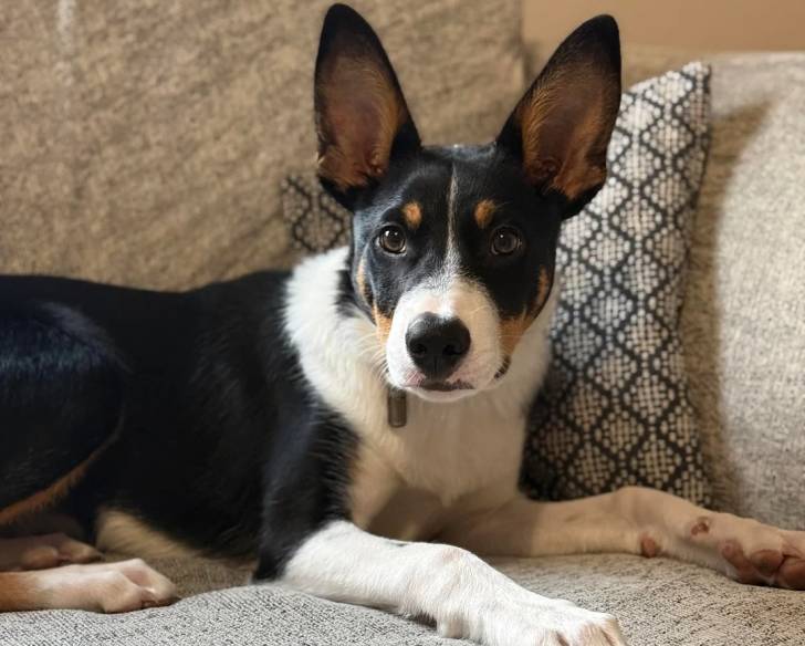 Un Kelpie Shepherd allongé sur un canapé et portant un collier autour du cou