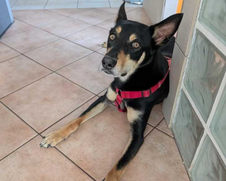 Un Kelpie Shepherd allongé sur un sol carrelé et portant un harnais