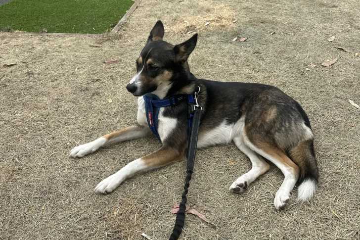 Un Kelpie Shepherd allongé sur une surface herbacée et qui est tenu en laisse