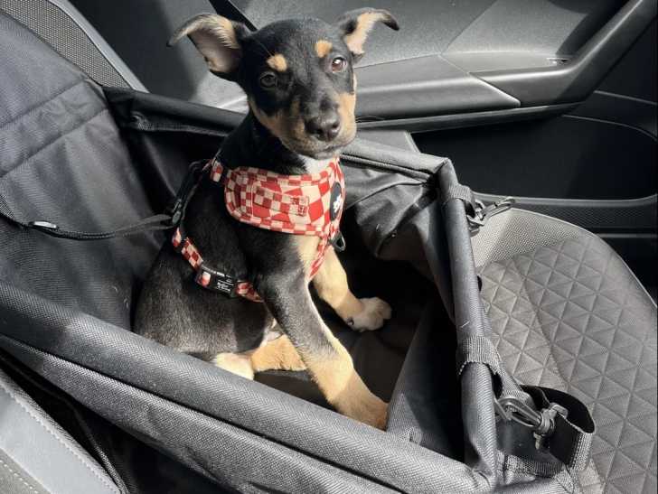 Un Kelpie Shepherd assis dans un panier à l'intérieur d'un véhicule et qui est tenu en laisse