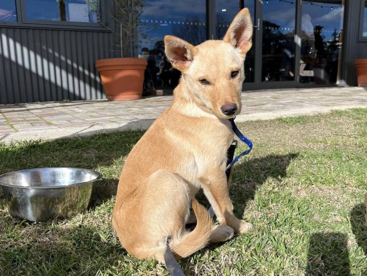 Un Kelpie Shepherd assis sur une surface gazonnée et qui est tenu en laisse