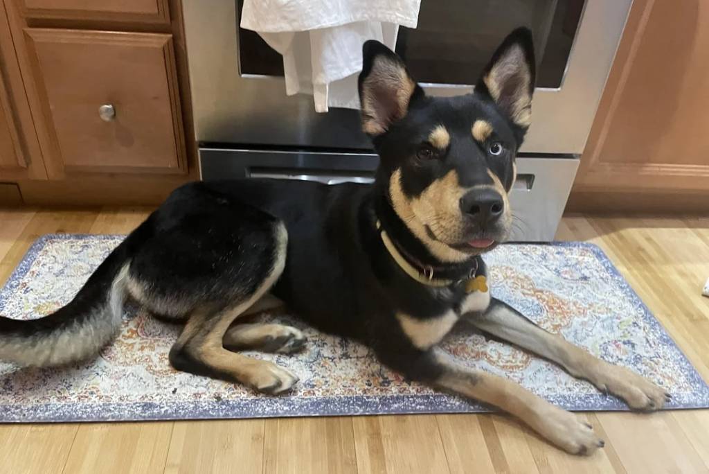 Un Kelpie Shepherd allongé sur un tapis et portant un collier autour du cou