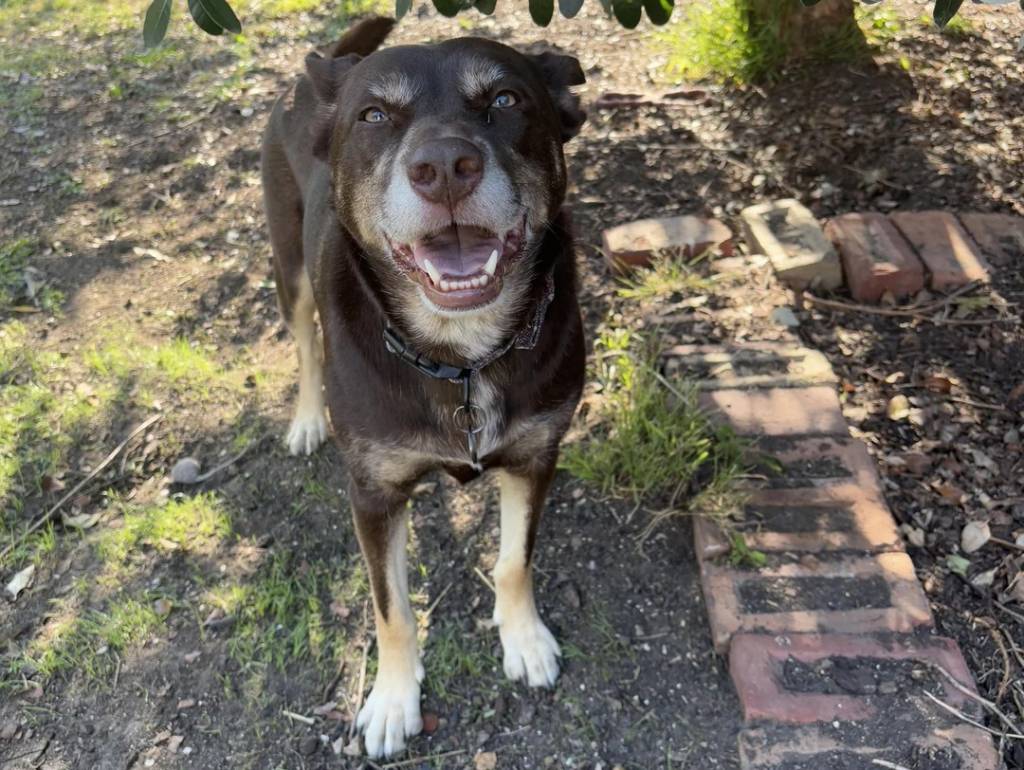 Un Kelpie Shepherd ayant la gueule ouverte et portant un collier autour du cou