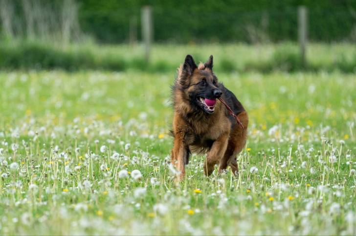 Un King Shepherd au pelage noir et feu, tenant une balle dans sa gueule et courant dans un champ