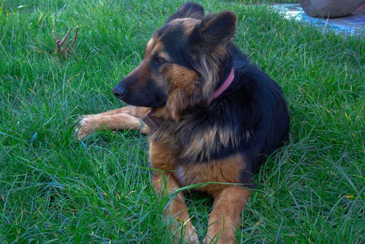 Un King Shepherd au pelage noir et feu portant un collier rose, allongé dans un jardin