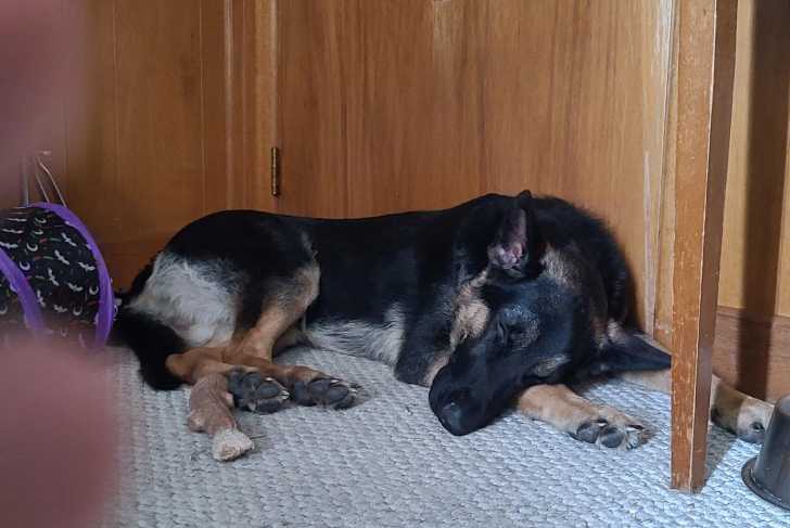 Un King Shepherd au pelage tricolore, allongé sur un tapis, dans une pièce et semblant dormir
