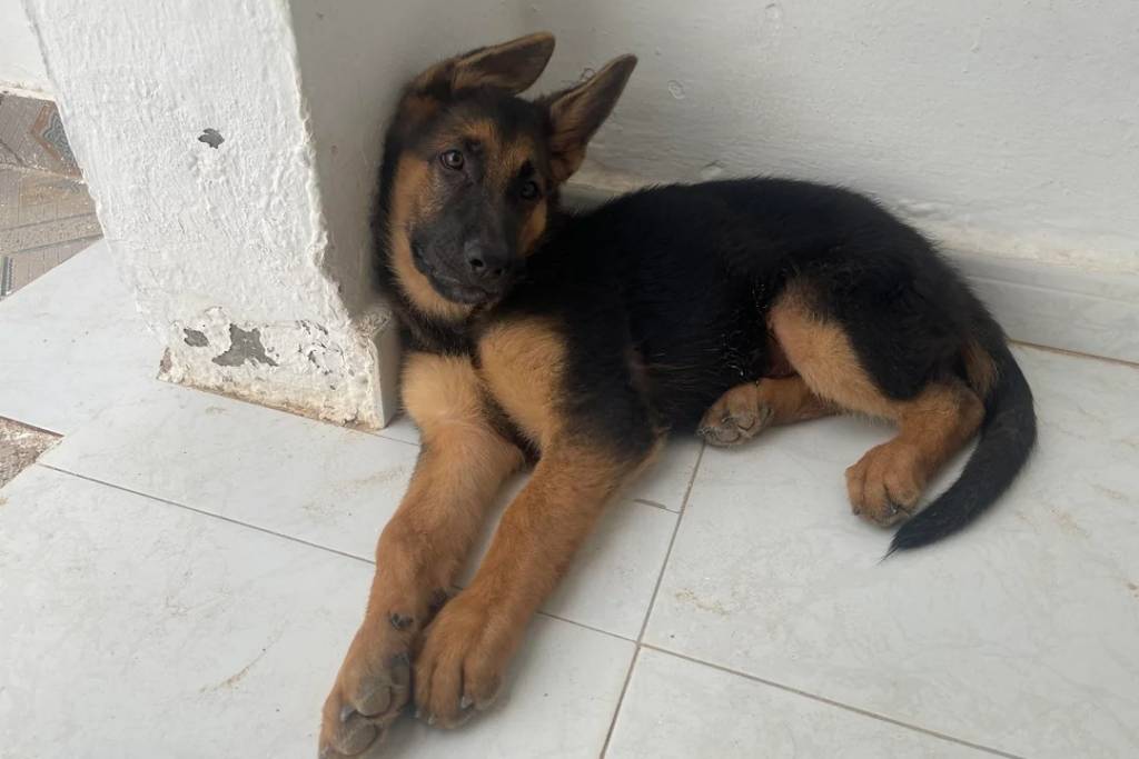 Un King Shepherd au pelage bicolore, allongé sur un sol carrelé et ayant la tête posée contre un mur blanc